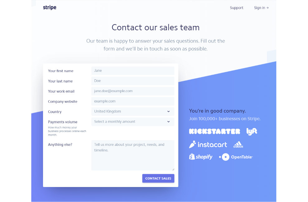 First, the page needs to be simple and easy to navigate for visitors. You don’t want to overcomplicate it and make finding answers difficult. Stripe’s contact us page is a great example of this – they use a clean design which is easy to use and they even include a list of companies that they work with – this helps to build up trust, in this case. However, what they lack is location and any other contact details, so not quite perfect for an ecommerce store.