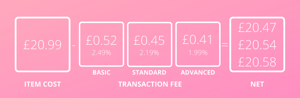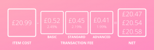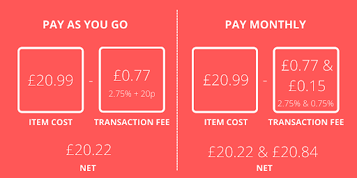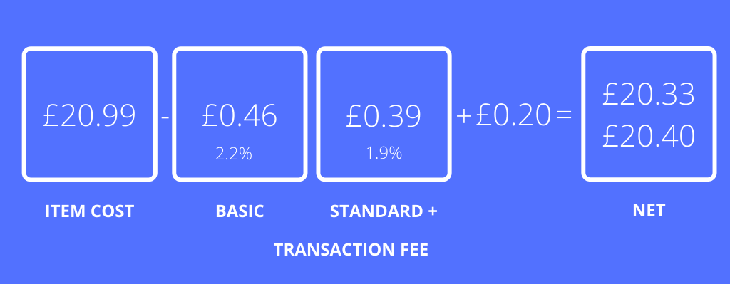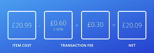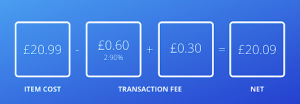 PayPal fees are currently 2.90% + £0.30p per transaction. To give you a better idea of how that would look, take a look at the example below. Remember that this would be for every transaction so the higher the value of the order, the higher the fee, so you would need to take this into account.
