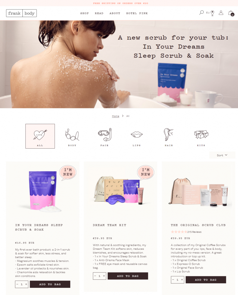 Line art is another design choice we are seeing more and more of this year. Clean and minimalistic lines to support icons like on Frank Body’s site help to create a more friendly and unique feel to the site. Accompanied by a typewriter font, this website design is perfect for their target audience and the line art style icons continue across their social media channels, providing brand consistency and recognition.