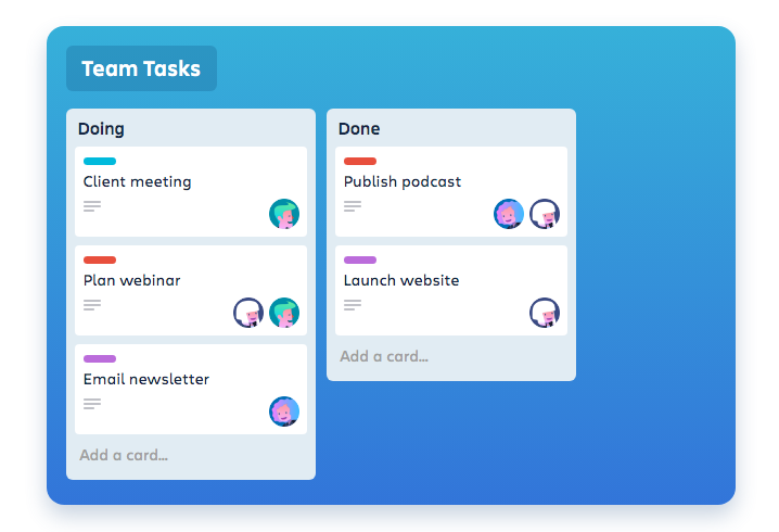 Trello is a productivity tool that helps you to keep track of your tasks in the form of lists. Cards can be created for each task and then can be arranged into separate lists, much like the example below.