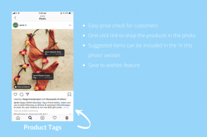 So every time you add a new post or a new story, you can choose to add in up to 5 product tags to encourage people to ‘shop the look’. Your customers will be able to see an image of the product from your post, a description of the product, it’s costs and a link that will take them directly to your website.