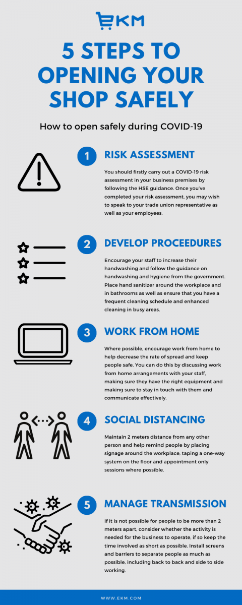 You should firstly carry out a COVID-19 risk assessment in your business premises by following the HSE guidance. Once you’ve completed your risk assessment, you may wish to speak to your trade union representative as well as your employees. Lastly, you’ll need to publish the results of your risk assessment on your business website.