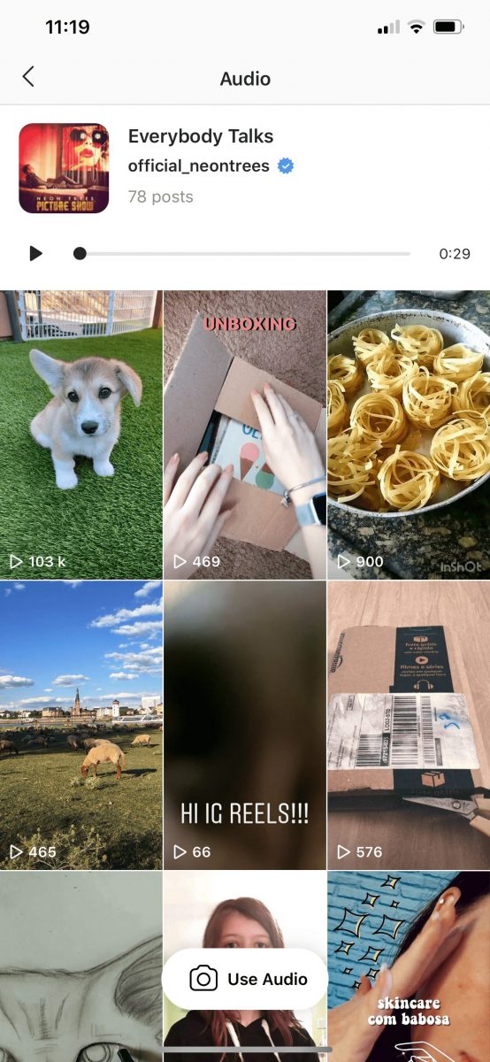 Below the caption on each video will be a linked song or audio track. By clicking on this audio you can see a list of other videos using the same file. You’ll also see the option to create your own video using the same audio.